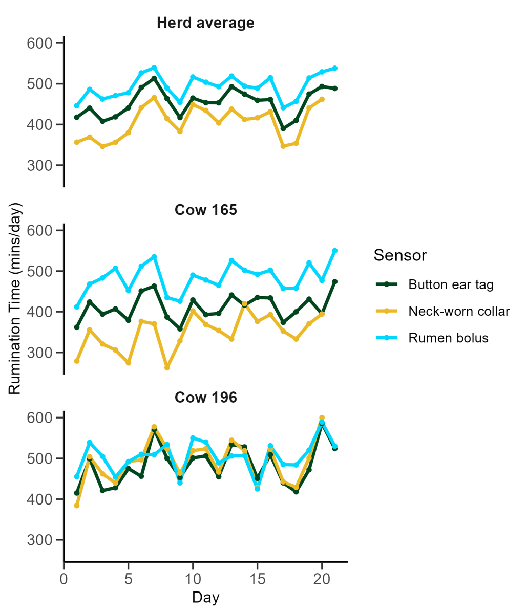 Although all three devices were tracking the same cows, the rumination values reported were different. The patterns were similar, though, for example, when rumination dropped on one device, it usually dropped on the others too.