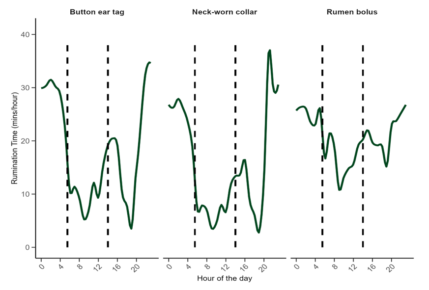 The study did not manually observe cows’ behaviour while they ruminated, so it was not possible to say which device gave the most accurate number. However, it’s more useful to focus on the direction and size of changes over time rather than the exact value.