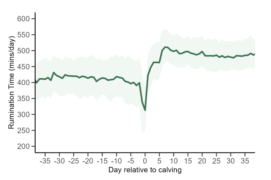 Rumination behaviour is predictable around calving. It typically drops sharply just before and during calving, then gradually recovers over the following one to two weeks. However, the speed and pattern of recovery can vary from cow to cow.