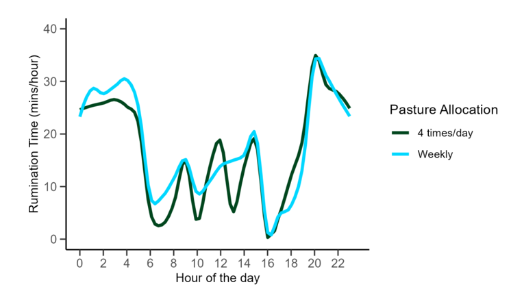 How and when pasture is offered also influences rumination. Offering the same total pasture allocation once or four times a day doesn’t significantly change the total daily rumination time, but it does affect when cows ruminate. Cows may ruminate more at night or between grazing sessions, depending on how feed is allocated.
