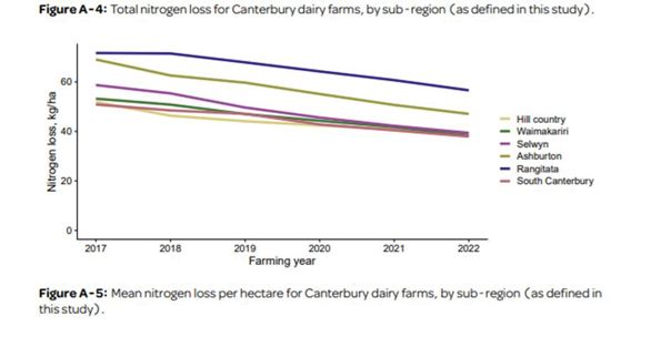 The analysis found that across about 302,000 hectares of dairy production land, the mean nitrogen loss per hectare in 2016-17 was 63.8 kg per hectare. This had reduced to 46.2 kg per hectare in 2021-22.
