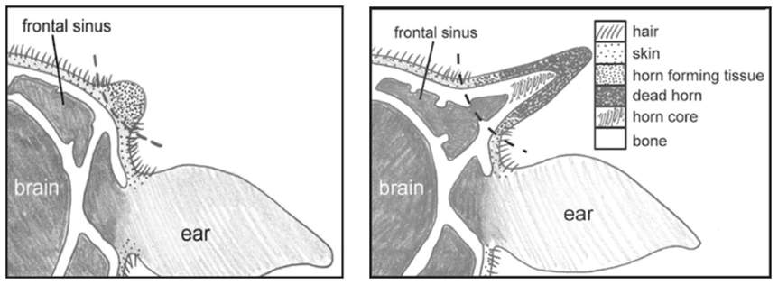 Horn bud before 8 weeks old (left) and around 6 months old (right)