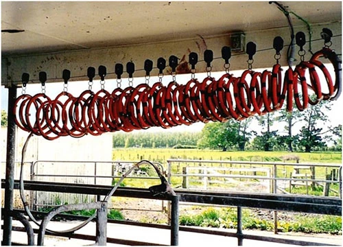 This coiled drench line takes the spray nozzle back to the bail area entry end, ready to be picked up again for the next time this row is drenched.