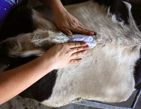 Some detectors are self-adhesive and some require gluing, always follow the manufacturer’s instructions. The device is mounted on the backbone with the top of the patch roughly between the hip bones. Adjust for the size of cow and aim for position that will receive maximum pressure from the brisket of the mounting animal. Examples include Kamar®, LIC Heat Patch, LIC Heat Patch Plus, Bulling Beacon, Heat Seeker Heat Detector.