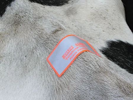 Heat mount detectors are applied to the rear portion of the backbone or rump region of each cow. Cows on heat will stand when mounted by herdmates or a bull and the detector will respond to the pressure or rubbing from the mounting animal, becoming brightly coloured and easily recognised.