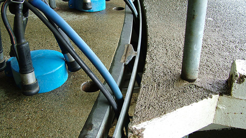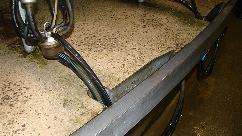 A slot to feed the rubbers through can be included as part of the concrete platform construction. The cluster can align itself with the cow and when not in use pull back out of the way of cows as they exit and enter.