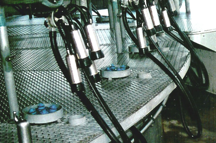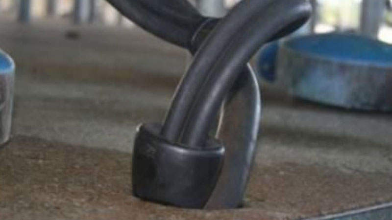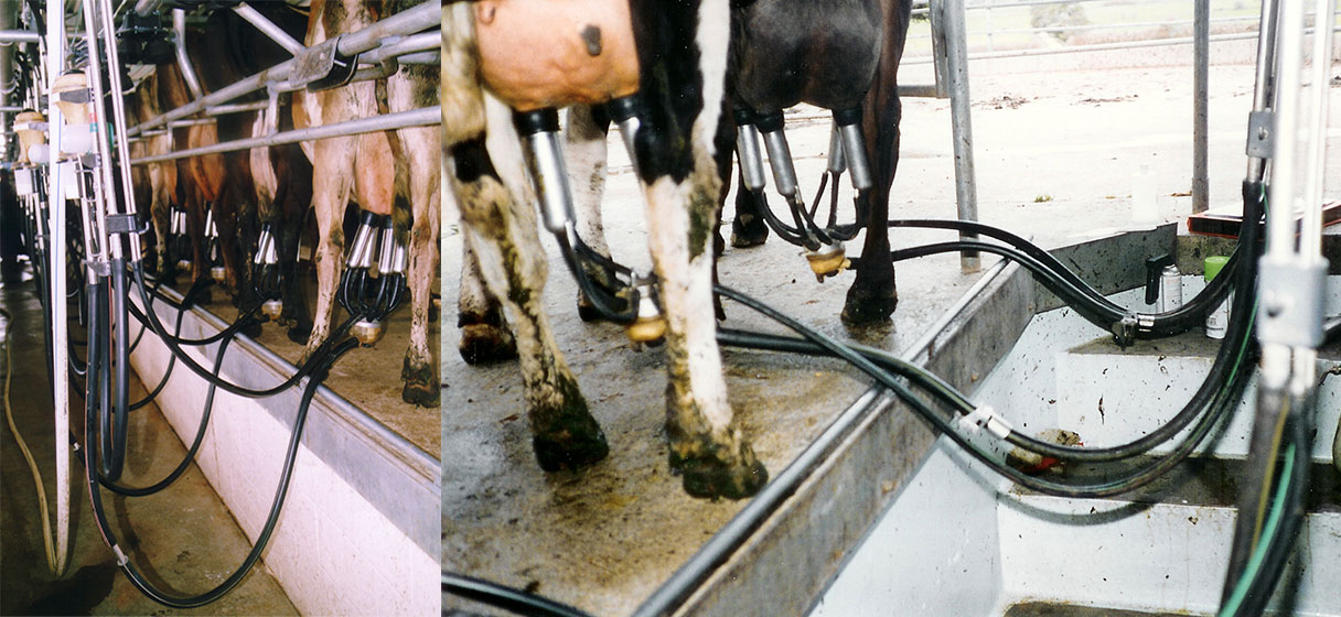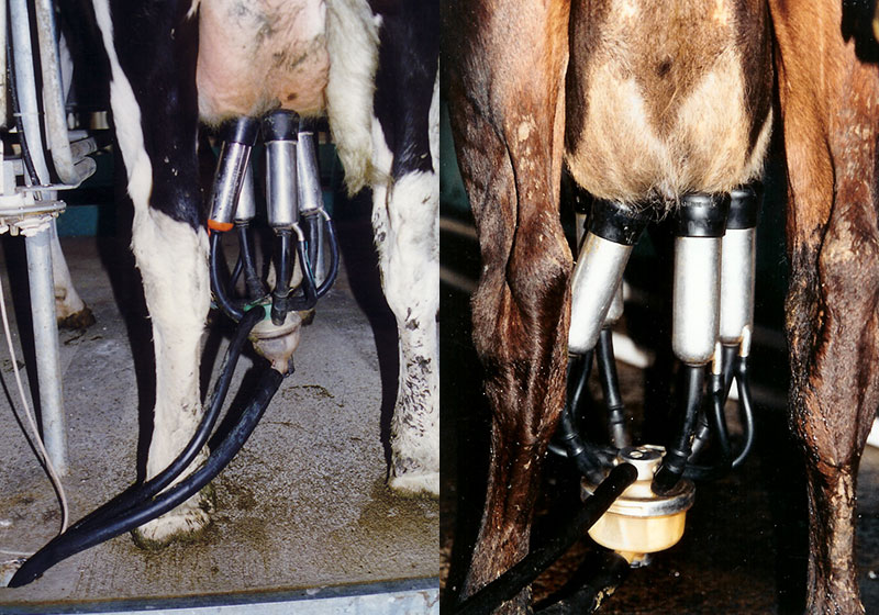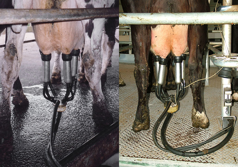 If clusters are attached between the back legs, the long milk and pulse tubes must line up with the cow’s backbone, with clusters sitting squarely under the udder.