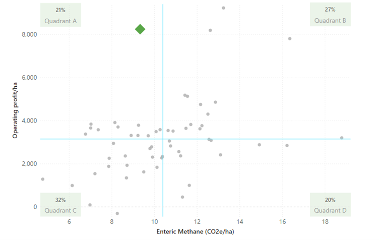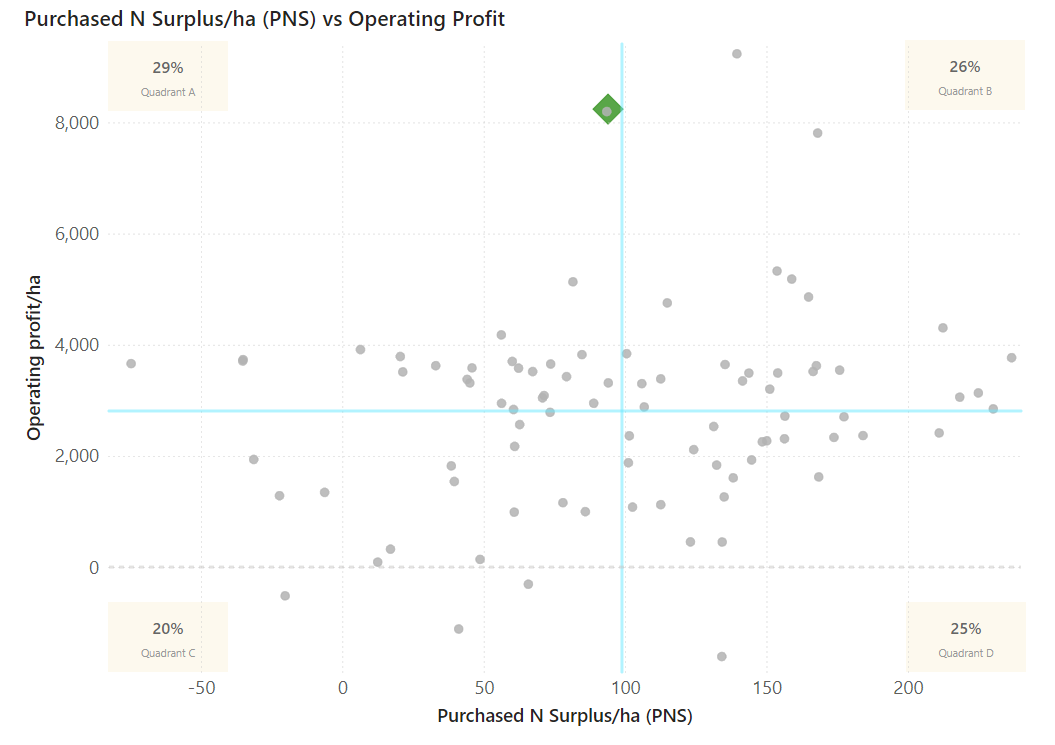 Purchased nitrogen surplus (PNS) is a measure that shows how efficiently a farm is turning imported nitrogen (from feed and fertiliser) into milk. The graph above shows the operating profit and purchased nitrogen surplus for Waikato DairyBase farmers for the 2022/23 season. The blue lines on the graph illustrate the intersection between profit and environmental footprint, showing where the average of the farms sit. The van Ras’s (indicated by the green diamond) had a higher-than-average operating profit and slightly below average purchased nitrogen surplus compared with other dairy farms in the Waikato region.