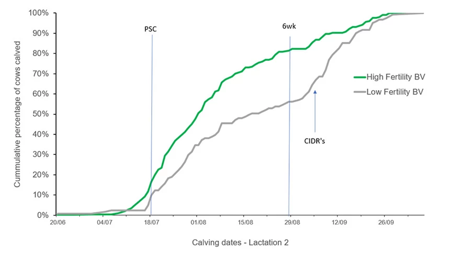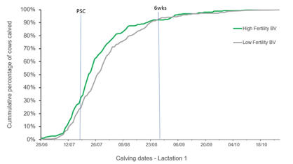 The key drivers for the greater 6 week In-Calf rate in high Fertility BV cows were substantially greater: