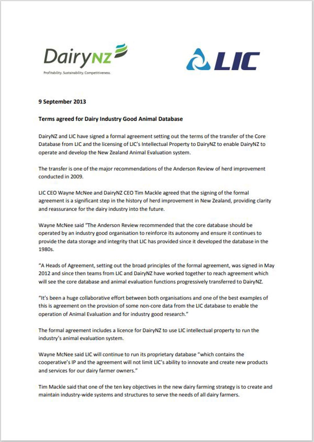 DairyNZ and LIC formal agreement setting out the terms of the transfer of the Core Database.